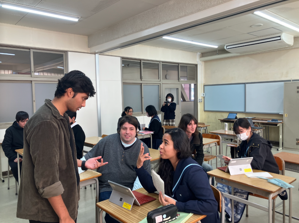 During the break, NUCB students were invited to join a campus tour, while some students chose to stay in the classroom to continue conversations in English.