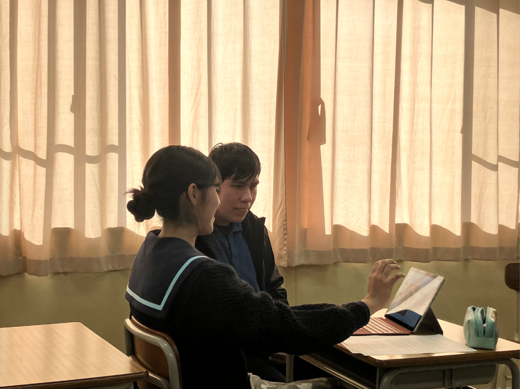 Because the class size was small, presentations were conducted individually. Each high school student presented while an NUCB student sat next to them, listening and asking questions afterward. Students rotated every seven minutes, and this process was repeated five times. Since the topic focused on food, many NUCB students commented that the presentations made them hungry.