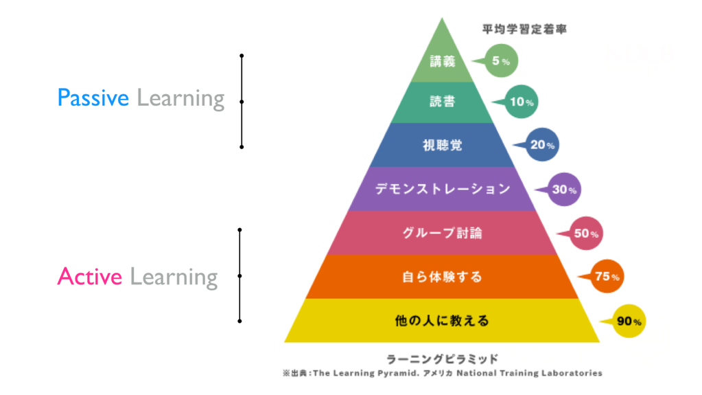 Active learning refers to lectures centered on participants. It is called Participant Centered Learning in the US and Europe, but it has been established as an educational method for a wide range of people from high school students to university students, working people, and corporate executives. However, as a basis for asserting the need for active learning, the following learning retention rate chart is often used.