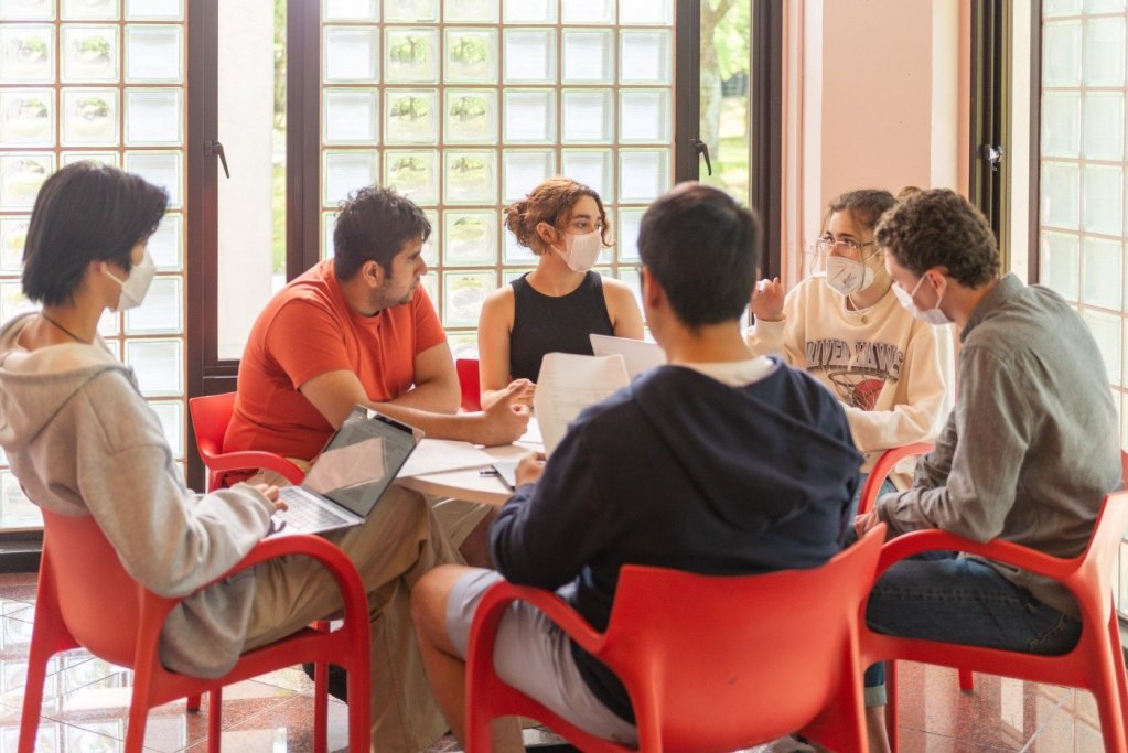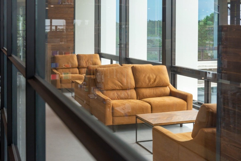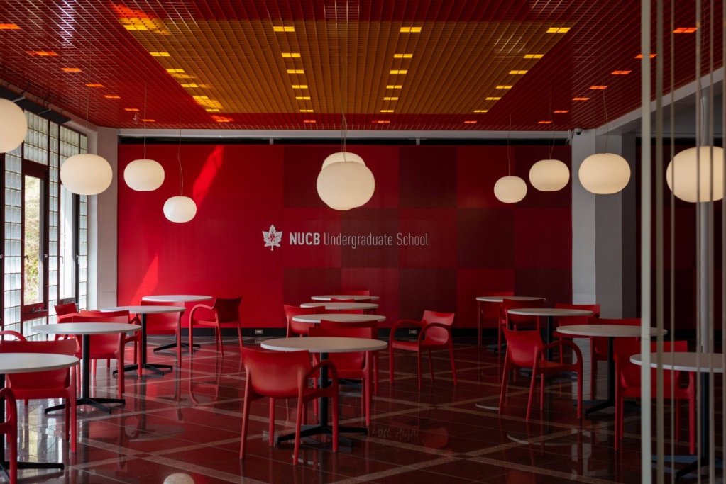 The red and white colored cafeteria and adjacent terrace attract many students every day. It is a bright and clean space where students can spend a peaceful time.