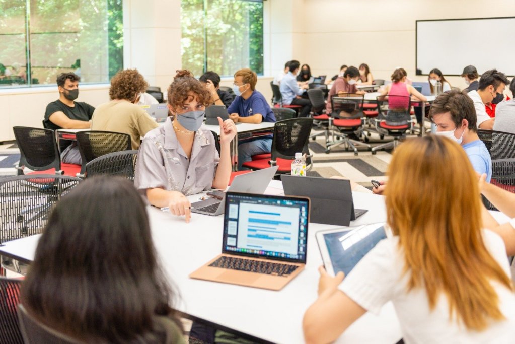 Classrooms 8201, 8202, and 8203 are group type. Round desks are set up to allow teams to work on the same assignment in a group setting, followed by presentations and discussions for more in-depth learning. The tables are spaced widely apart and arranged in such a way that faculty members can easily move to students' seats.