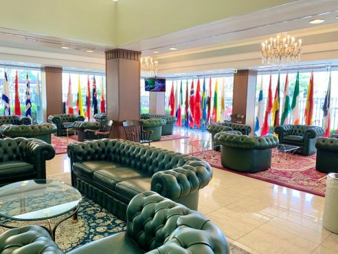 Flags representing the nations of current and past students and faculty as well as NUCB's partner schools are displayed in the lobby area.
