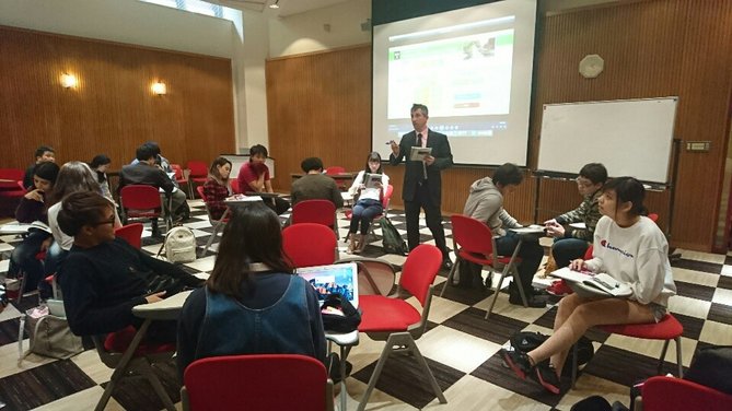 今回の講義ではアメリカとスコットランドの大学生のインタビューから、それぞれの国で異なる価値観について読み取りグループで話し合います。もちろんこの講義もすべて英語で行われ、学生はグローバル化社会の競争のなかで私たちが私たちらしくいるために必要なことは何か、苦労しながらも一生懸命思いを巡らせ発言し、互いの意見を共有し理解を深めていました。