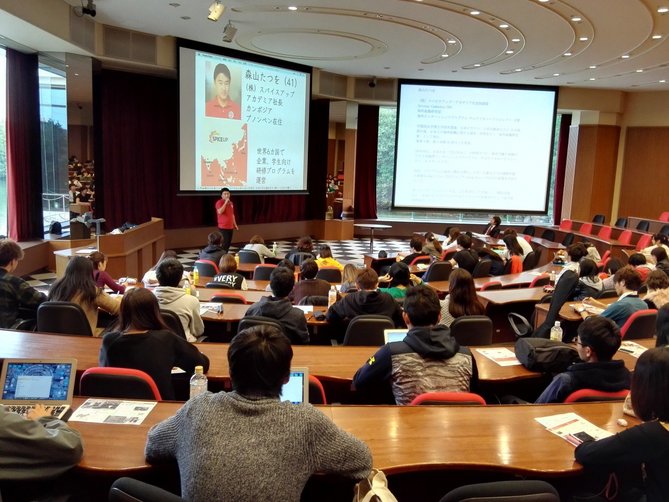 10/20(金)にキャリア形成総合講座を開催致しました。今回はカンボジアでサムライカレープロジェクトというインターンシップ事業を運営する森山たつを氏にお越しいただきました。サムライカレープロジェクトとは主に大学生を対象にカンボジアという未知の国で学生たちが試行錯誤しながらカレーを販売するというプロジェクトです。将来海外で就職したい学生や、起業したい学生、行動力を身につけたい学生などが集まり、自分たちで実際のマーケティングを行い、自分たちで開発した商品を売ります。このような経験をすることで自立心や問題解決能力、起業する力などを身につけます。森山氏はチャンスが多くある世界に飛び出してチャレンジしてみることの重要性を学生に伝えていました。