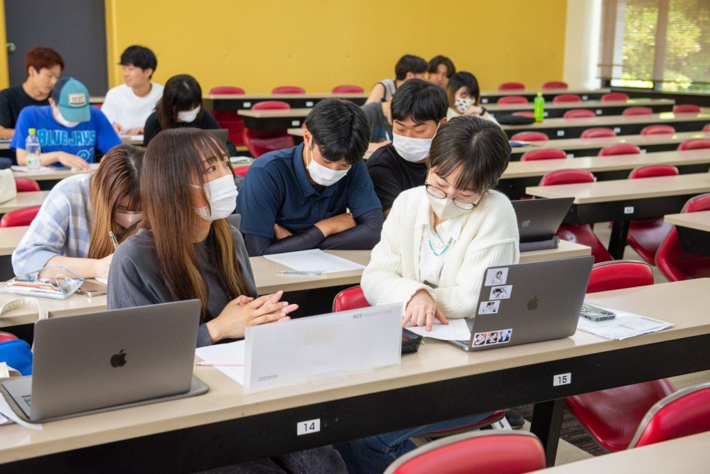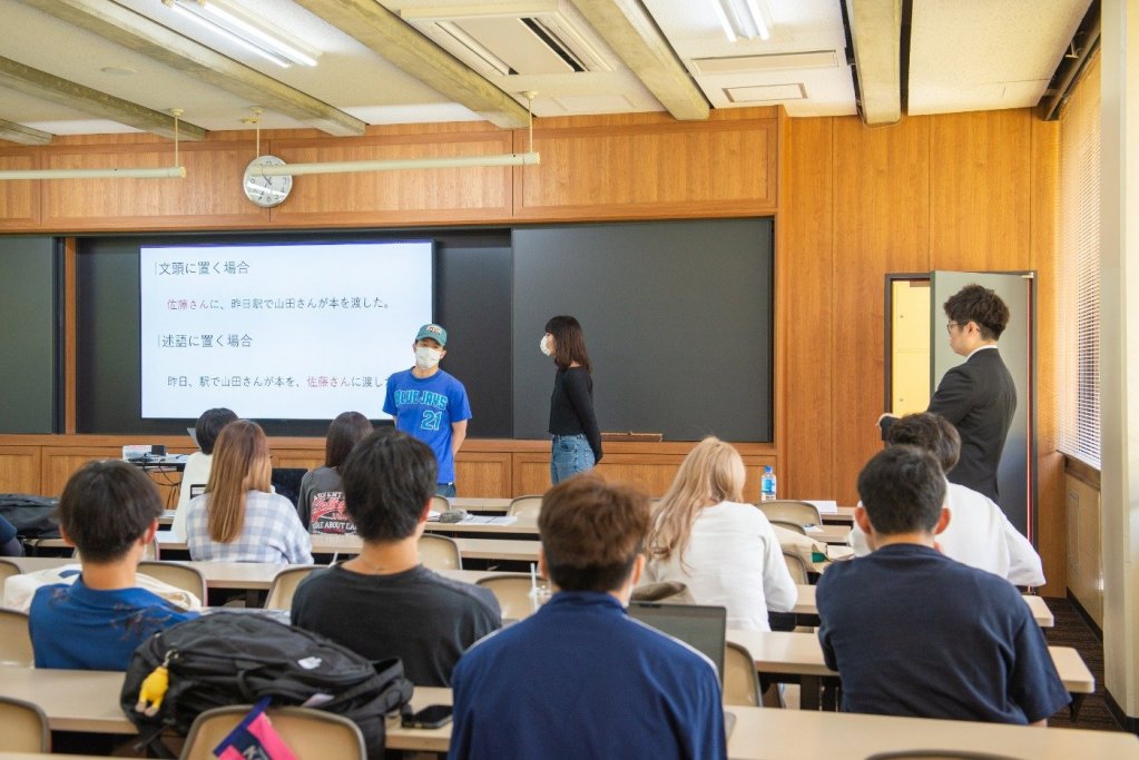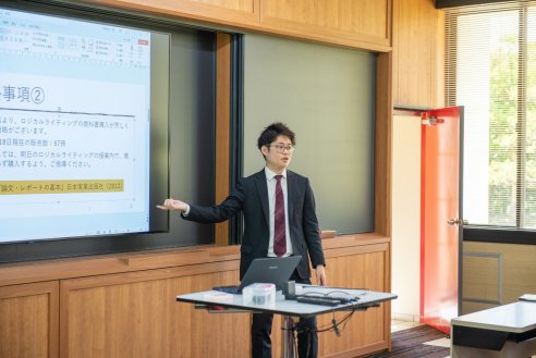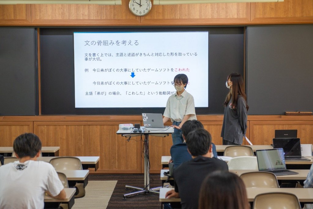甲賀真広専任講師による「ロジカルライティング 1」の授業の様子です。レポートや卒業論文を書くうえで必要な論理的なライティングスキルをいちから学びます。この日は『言葉と言葉の関係を考える』というテーマで、どうしたら文章が読みやすいかを学びます。主語と述語を整える文章の骨組みや、語順についての基本ルール、強調の仕方など、文章を書くときの基本的な考え方をそれぞれスライドにまとめて発表していました。