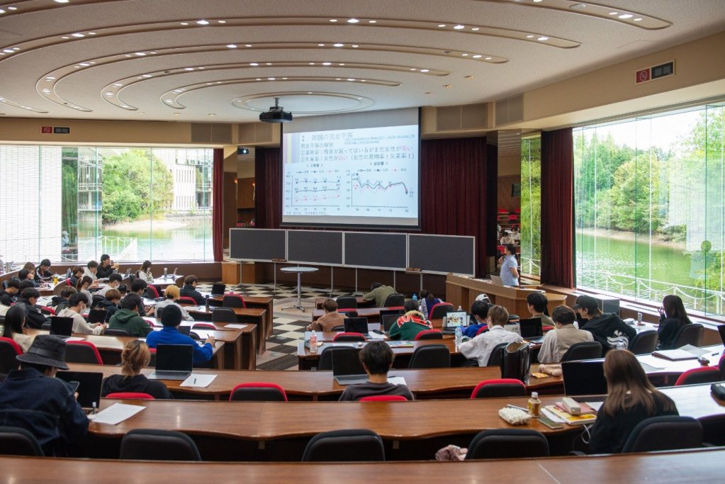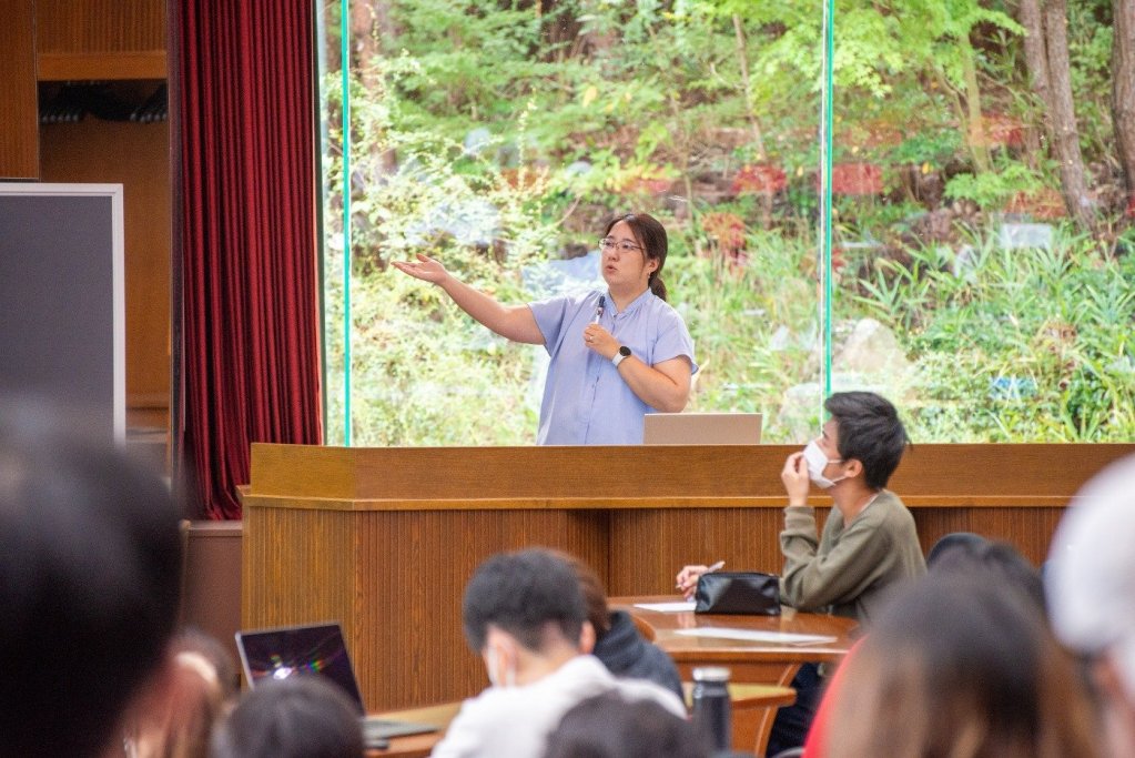 閔ソラ先生は、そのような事例に対しての学生の意見をマイクを回して広く集めていきます。学生からは、「夫の実家では嫁が働くことが昭和の日本に似ている」や「男性の子育ては女性を手伝うという認識である」といった声が上がりました。