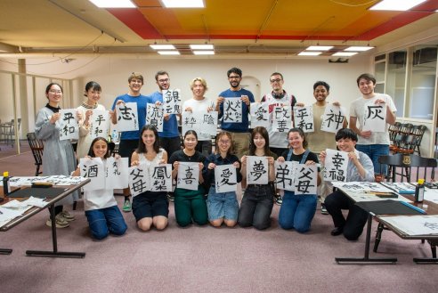 海外提携校から年間100名を超える交換留学生が来学する名古屋商科大学では、その留学生たちに日本の文化を体験してもらおうと、毎年様々な複数の国際交流イベントを開催しています。6月5日(水)に開催された書道体験イベントには、18名の留学生と、留学生と一緒に書道がしたい日本人学生や書道が得意な日本人学生14名が参加し、イベントは大いに盛り上がりました。