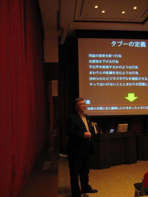 まずタブーを定義し、その上で業界別のタブーについて会場との意見交換を行いました。その後、タブーに挑戦することで新しい市場を開拓した商品とサービスについての考察を通して、イノベーションと品質が欲求を刺激する商品戦略についての示唆をいただきました。