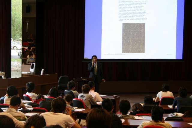 2009年度第10回総合講座「バイオサイエンスの威力と限界」 2009/06/11 Thu #バイオサイエンス #総合講座 #遺伝子工学 露無慎二先生 6月11日に第10回経営学部・総合講座が行なわれました。今回の講師の方は日本植物病理学会長も務めておられる理学博士、露無慎二先生です。講演のテーマは「バイオサイエンスの威力と限界」と題して、遺伝子組み換え作物や微生物による医薬品の生産など、我々の生活でも身近になりつつある遺伝子工学についてお話をいただきました。学生からは「普段、このような理科系の話を聞く機会が少ないため新鮮でした。」との声が出ていました。
