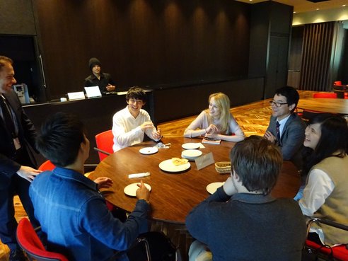 名古屋キャンパス丸の内タワーにて、都心型コースの国際ボランティア参加者を対象にLanguage Exchange(言語交換)を開催いたしました。Language Exchangeとは、名古屋商科大学と本学大学院の留学生と交流をしながら、お互いの言語や文化の理解を深める国際交流の機会です。今回は、都心型コースの学生10名と留学生10名の合計20名が、丸の内タワーのLearning Salonにて昼食の時間にピザを食べながら、英語と日本語で自己紹介や会話を楽しみました。丸の内タワーのLearning Salonは、食事が取れる学修スペースとなっており、グループディスカッションがしやすい円卓が並べられています。国際ボランティアを夏に控える都心型コースの学生は、この機会に国際交流をすると共に、今後の学力向上に向けて自身の課題へ取り組みます。今回参加した学生たちは、語学力の必要性を強く感じるとともに、海外の人と異文化交流する楽しさを見出した様子でした。Language Exchangeは今後も定期的に開催し、学生と留学生がコミュニケーションを図りながら、お互いの文化の理解を深め語学力向上につなげます。