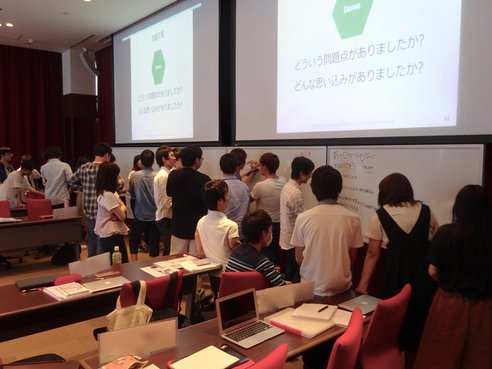 本日は井坂智博先生による「デザインシンキング」の講義でした。デザインシンキングとは、近年企業でも取り入れられてきている新商品やサービス創造の手法で、「技術・市場目線」ではなく、「生活者目線」で生活者さえ気づいていないニーズをつかみ、解決策を考えていく手法です。学生たちはデザイン思考の基礎となる5つのステップを使ったグループワークと、インタビューを行いました。「絆創膏」を題材に問題提起し、ブレインストーミングしながら改善案を話し合いました。どのようにすれば絆創膏はより使いやすくなるのかを、実際に使用しながら自分たちの目線だけでなく、「例えば視覚障害者の目線から見たらどうか」という観点からも意見を出し合いました。Term1で培った積極性を発揮し、細かい部分まで視野に入れて観察した意見がどの学生からも多く出ました。次に「財布」の改善点は何かを、2人1組でインタビュー形式で行いました。インタビュアーが使用者に提案する手法をとると、使用者が気づいていないニーズを探るという新たな発見があったようです。アクティブラーニングでは講義を通じて、内容だけでなく多様性を取り入れて考察することができます。