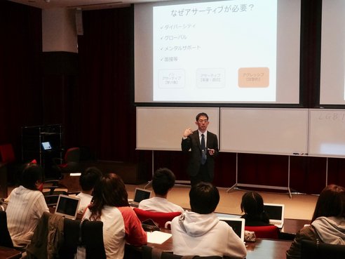 就職に強い名古屋商科大学では、1年次からキャリアサポートを行っています。名古屋キャンパス都心型コースでは、2年生の希望者を対象としたキャリアサポートプログラム「アサーティブゼミ」が開講されました。本学大学院でMBAを取得し、キャリアコンサルタント国家資格を有する野嵜晃弘さんをお招きし、週1回2時間かけて行います。