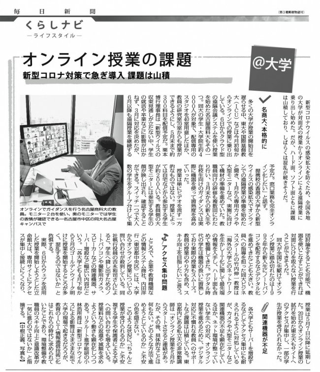 全国に先駆けて実施できた本学のオンライン授業 2020年4月27日(月)の毎日新聞朝刊に本学のオンライン授業の取り組みが大きく掲載されました。昨今の新型コロナウイルス感染症(COVID-19)の感染拡大を防ぐため...