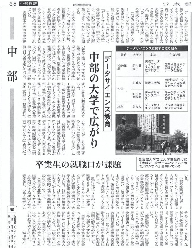 データサイエンス教育の重要性 日本経済新聞朝刊(2021年9月14日発行)にデータサイエンスに関する取り組みを進める大学として、本学のデータサイエンスコース(2022年4月新設)が掲載されました。中部地方の大学...