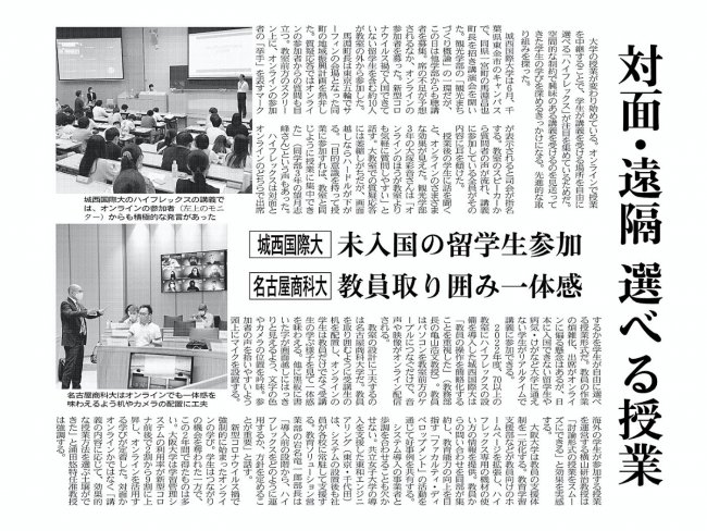 日本経済新聞朝刊(2022年7月6日発行)にハイフレックス授業を実践する先進的な大学として、本学が掲載されました。変わり始める大学の授業。オンラインで授業を中継し、学生が受講する場所を選択できる「ハイフ...