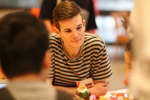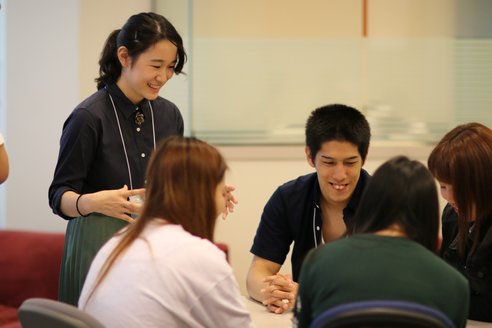 ランチタイムには留学生と楽しいアクティビティをして触れ合える、International Village〜留学生と交流しよう〜が開催されました。最初は戸惑いながらもすぐに留学生たちの笑顔につられて、どの参加者も楽しそうにゲームをしたり会話していました。