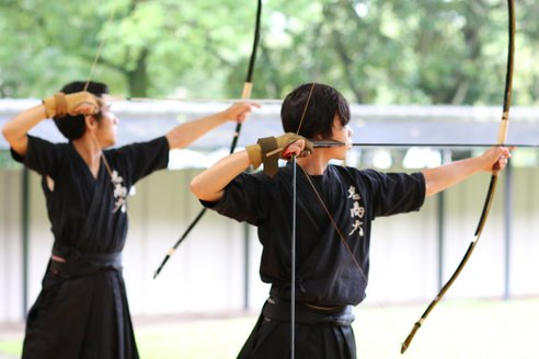 弓道場では雨の中、皆真剣な表情で矢を放ち的中した際には「よし!」と大きな声で威勢良く練習に励んでいました。見ている参加者もその熱気に、吸い込まれそうに見入っていました。