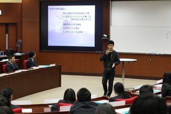 本日、日進キャンパスにて高校見学会が行われました。総勢84名の生徒さんにお越しいただきました。経営学部経営学科3年の学生によるプレゼンテーションでは、留学前と留学後の変化について話してくださりました。彼が参加したギャップ・イヤー・プログラムとは、約70日間をかけて、各自の自主的な計画に基づき、ヨーロッパを舞台に単独で調査やボランティア活動を行います。欧州ではすでに定着している習慣を参考にしたもので、海外での生活を通して自分を見つめ直し、世界的な視野を持った人材へと大きく成長することができます。発表者はギャップ・イヤー・プログラムに参加した後に、「リーダーシップ」や「行動力」が身に付き、なんとビジネスコンペティションの全国大会に出場した経験があるそうです。このように本学には留学経験を通じて、積極性が身についたという自身の“変化”を感じる学生がたくさんいます。