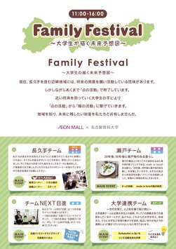 名古屋商科大学「NUCBフロンティア力育成講座」の受講生約20名が中心となり、家族に楽しんでいただくことを目的として、長久手市、日進市、瀬戸市のリニモ沿線地域の特性を活かしたイベント企画を考案し、実際の準備・運営まで行います。