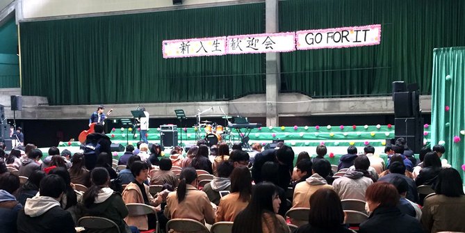 歓迎会では、まずは大阪ノスタルジックピアノロックバンド「アイビーカラー IbeCALLER」さんから新入生へのお祝いのLIVEにはじまり、軽音楽部やフォークソング愛好会の演奏や合気道部の演武、ストリートダンスサークルのショーケースなどがステージで行われ、多くの学生がステージ前に集まり興味深くイベントに参加する姿にこれからの明るい学生生活が目に浮かびました。