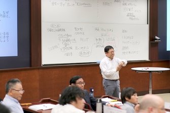 模擬授業後の振り返りでは、ケースメソッド研究の第一人者で本学ビジネススクール教授の竹内伸一先生がファシリテーターとなり、ケースメソッドの有効性や板書の活用法、理論をどのように教えるかなど、教員や参加者の立場になって様々な考え方や意見、クラス全体の運営について議論を行いました。当日は参加者を中心に大変白熱した議論が展開されました。