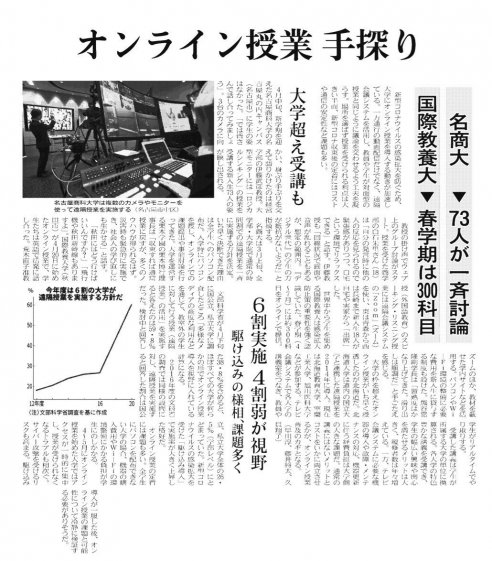 全国の大学にオンライン授業を導入する動きが加速している中、早くから一方通行の動画配信ではなく双方向の遠隔授業を実施している本学での取り組みが詳細に紹介されています。オンライン授業が全国的に手探りで行われている中、全学生にパソコンを無償譲渡し、オンラインでの課題提出や事前討論を導入してきたことにより、いち早く実施できた本学の様子や、実際にオンラインでの授業が行われている写真が大きく掲載されています。