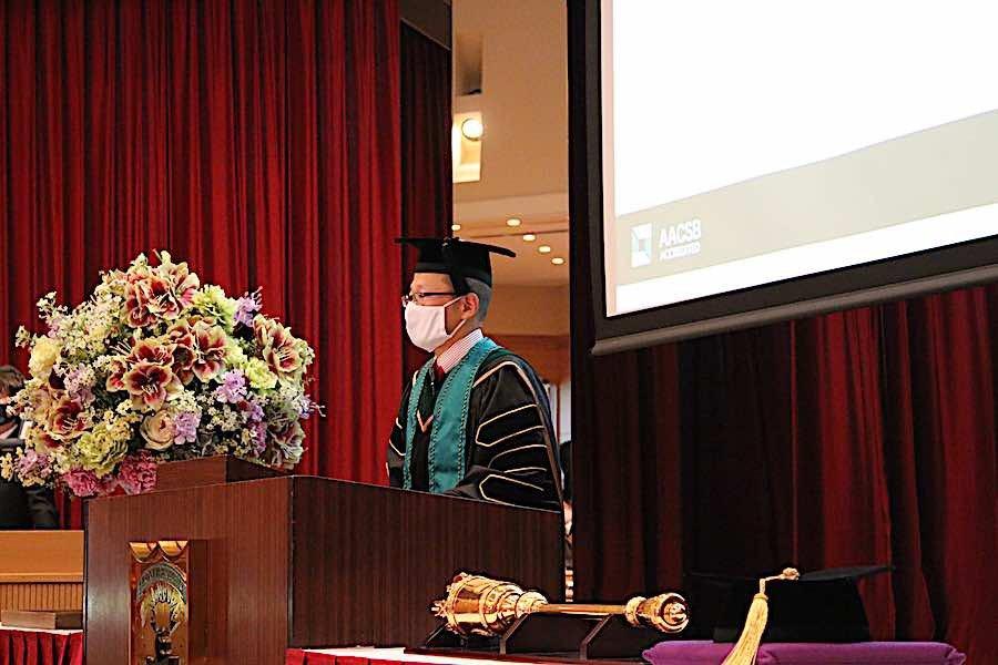 式典では、まず初めに商学部学部長である小野裕二教授から卒業生一人ひとりに学位記が授与され、その後、小野教授より卒業生へ祝辞が贈られました。