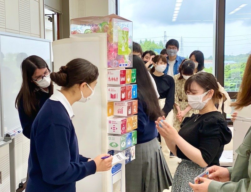 SDGs倶楽部「Sus-Teen!」による報告では、メダカやアサガオの生態観察などの身近な取り組みから、行政との合同事業による公園の活性化、外国人の生活をサポートする「サスナビ」など、社会的な取り組みについて紹介されました。さらに、高校生が桂新堂、若鯱家と「食品ロスについて美味しく考えてもらう」ことをコンセプトに共同開発した「サステナブルえびせんべい」も紹介。えびせんべいが当たる「Sus-ガチャ」体験では、学生が楽しみながらSDGsの17のゴールについて学修できたようです。
