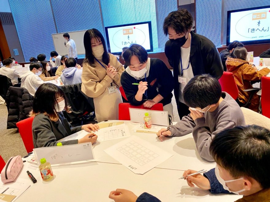 ビンゴカードを用いて自己紹介を行い、緊張が和らいだところでアイスブレイクへ。お題となる部首の漢字を多く書き出すゲームを開催しました。仲間と協力しながら白熱した様子で進行し、見事20個の漢字を書き出したチームが優勝しました。