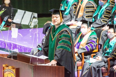 ご来賓のSpace BD株式会社 代表取締役社長 永崎将利様からの祝辞では、「運・縁・恩が人生を作る」「実践こそが全て」「過去の自分は将来の自分が肯定するものである」の3点について大変貴重なお話をいただきました。自らの経験をもとに、人との出会いから思いも寄らない転機が訪れること、全く知見がないことに不安を抱くより大胆に挑戦することの大切さ、どんな経験も無駄ではなく心の学びを得られること、など学生生活の始まりを迎えた新入生の心に響く内容でした。最後に新入生に向け、学びと感動の学生生活を送ってくださいと熱いエールも送っていただきました。