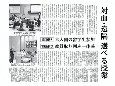 日本経済新聞朝刊(2022年7月6日発行)にハイフレックス授業を実践する先進的な大学として、本学が掲載されました。変わり始める大学の授業。オンラインで授業を中継し、学生が受講する場所を選択できる「ハイフレックス」が注目を集めています。ハイフレックス授業の現状と今後の課題や展望についても紹介されています。
