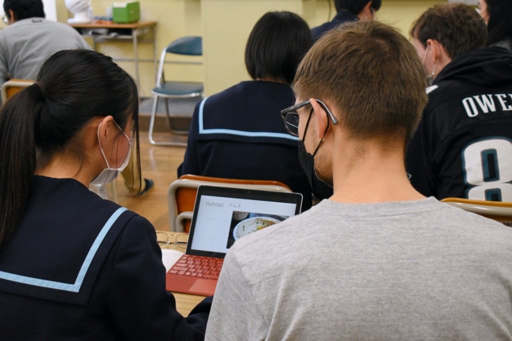 日進高校の英語科クラスと本学の留学生との交流授業が行われ、本学より9名の留学生が参加しました。最初は、高校生も留学生も少し緊張気味でしたが、自己紹介やお互いの好きなものについて話をする中で、徐々に笑顔が見られ、英語で楽しそうに会話できるようになりました。また、高校生が用意した外国の食事についてのプレゼンテーションを聞き、留学生が感想やアドバイスを伝える活動では、留学生の言葉に真剣に耳を傾ける高校生の姿が見られました。