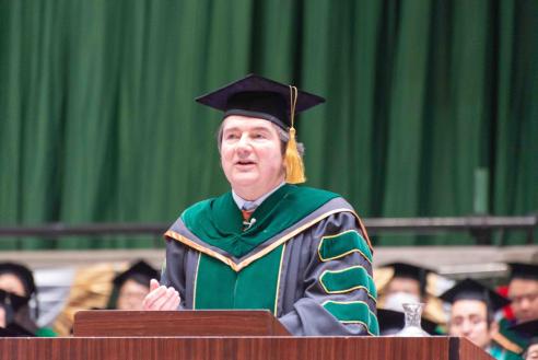 2025年度入学式では、経営教育における国際認証機関 AMBA & BGA の代表であるアンドリュー・メイン・ウィルソン 氏を英国よりお招きし、新入生への祝辞が贈られました。AMBAは、世界70か国以上のトップビジネススクールに認証を与える国際機関で、名古屋商科大学は日本で初めてこの認証を取得し、世界でもわずか2%の「Triple Crown」認証校として高く評価されています。