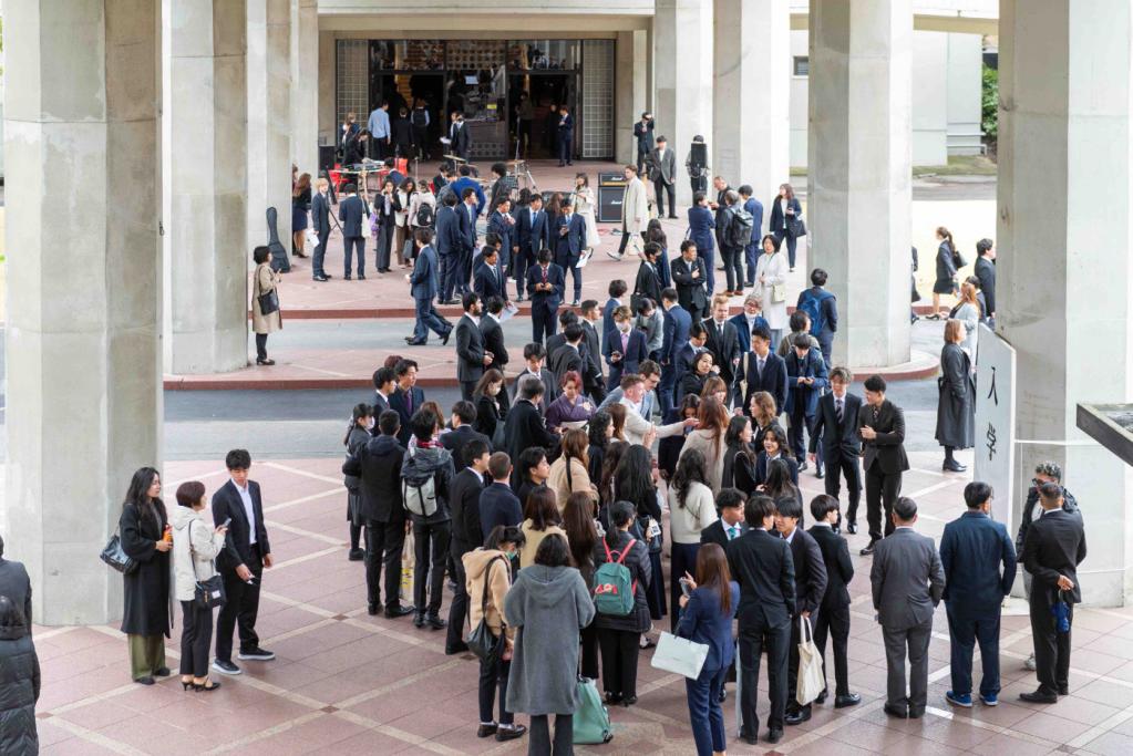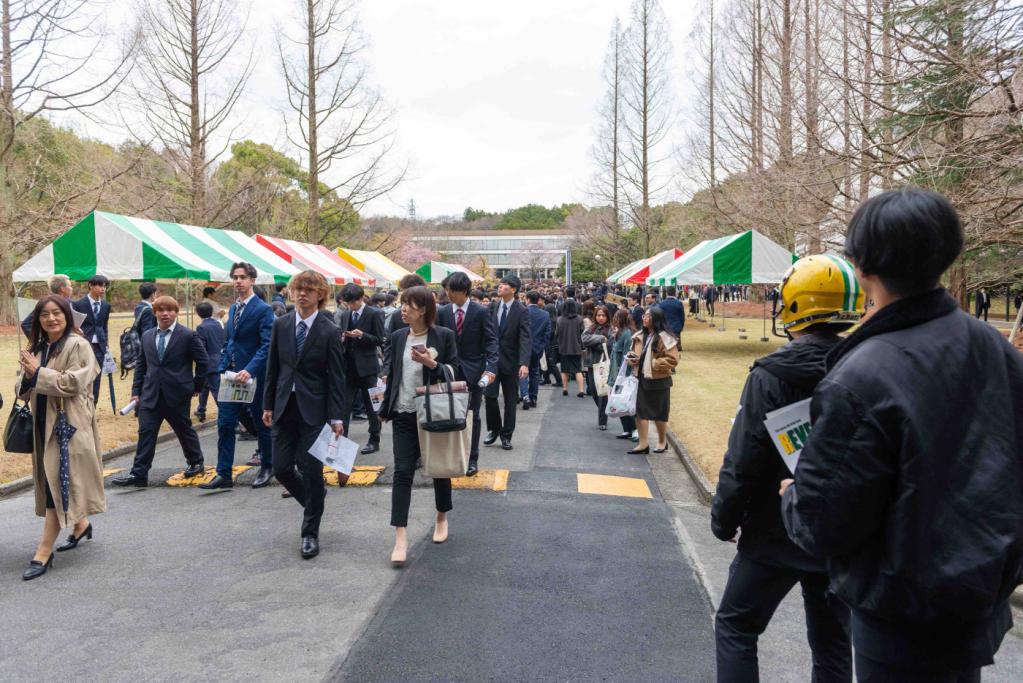 式典終了後、会場の外では、体育会・文化会のクラブやサークルの活動を紹介する先輩学生たちが、新入生を賑やかに出迎えていました。