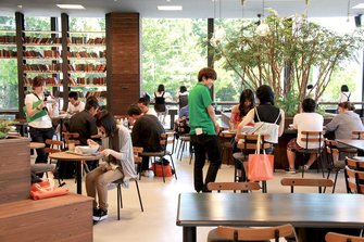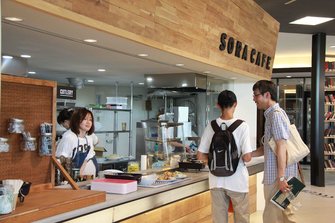 学生に大人気の学食 SORA CAFEで無料ランチを提供。交換留学生や在学生とともにランチを楽しんでいただきました。