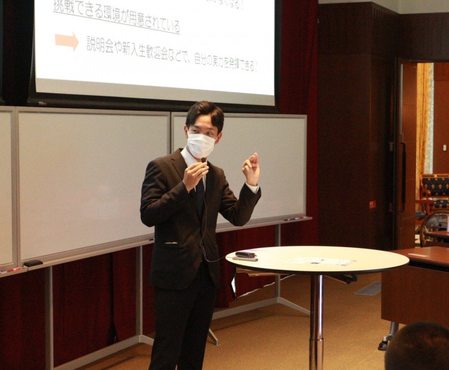現在社会人として働いている名古屋キャンパスの卒業生に、社会人になった際には何が求められ、必要な力は一体何なのかを実体験を交え語って頂きました。本学ではケースを使用したアクティブラーニングの授業を行いますが、そこではどのような姿勢で授業に臨み、そこではどのようなスキルや力を習得することができるのか、体験談を聞くことで具体的に想像ができたかと思います。卒業生のプレゼンテーションを間近で聞くことで本学で培われた話術やプレゼンテーション力を実感し、社会に出て本当に必要な資質を本学で学ぶことができるとわかっていただける機会でした。