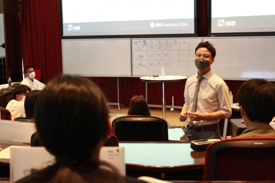 本学で行われているMBA流の授業を体験していただきました。関根豪政先生による体験授業では、「ワクチンが足りない!?」をテーマに、架空のケースを用いて日本、EU、ガナール共和国(架空の国)、WHOそれぞれがワクチンの配分について話し合うという授業でした。初めは参加者同士で討論することに皆さん戸惑った様子でしたが、時間が経つにつれ慣れていき、一人一人が自分なりの意見やその理由を積極的に発言する様子がうかがえました。最終的には教室全体で議論し盛り上がり、笑いが絶えない楽しい授業になりました。普段の高校の授業とは一味違ったアクティブラーニングを体験することで、その授業の学び方、そして面白さを体感していただけました。