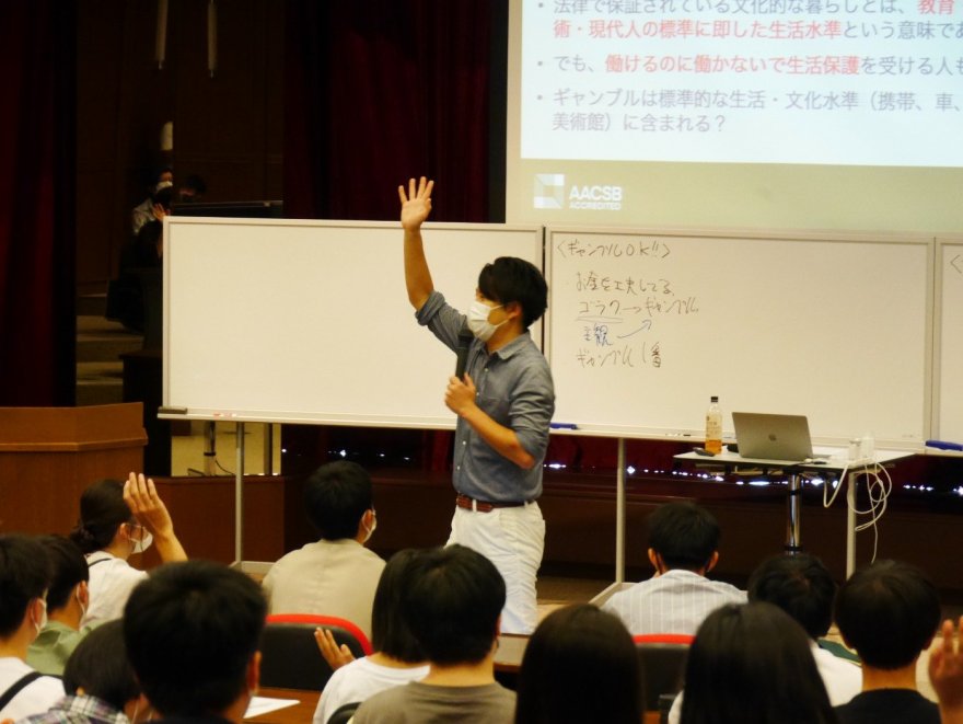 吉井哲教授による体験授業では、経済倫理のケースメソッド授業を実施しました。「生活保護者がギャンブルをすることの是非」について授業を展開。憲法で保証されている健康で文化的な最低限度の生活とはなにか、参加者同士意見を交わし議論を深めました。