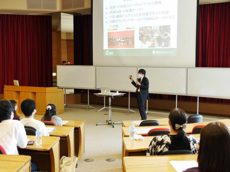国際系プログラムの参加者には、本学が提供する国際教育についてより詳しくご紹介。磯野英治准教授より国際学部の教育の特色について、国際交流担当スタッフからは豊富な留学制度をご説明しました。また、海外体験の魅力を実際に留学プログラムに参加した学生のプレゼンテーションでお伝えしました。
