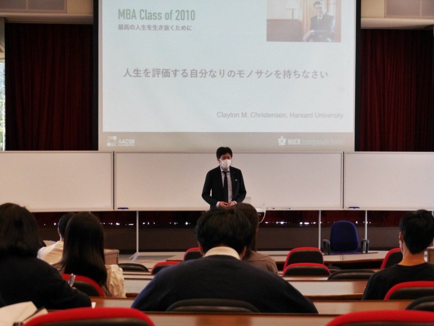 名古屋商科大学 栗本博行学長と経営大学院研究科長補佐 横山研治教授による特別講演が実現。横山教授より、国際的に高く評価される名古屋商科大学の教育や質の高い教育環境を提供し続ける本学の取り組みについて、栗本学長からは、ビジネススクールを提供する大学で学修することの価値や人生を自分で評価し決定することの重要性など、様々な視点から高校生に向け語りかけました。