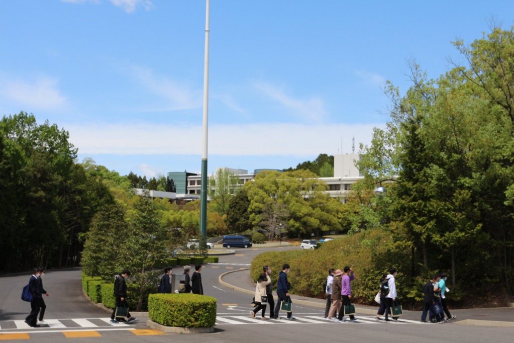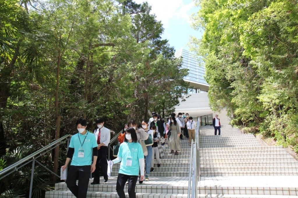 愛知県私大No.1の敷地面積を誇る自然豊かな日進キャンパスをご案内。アクティブラーニングに適した造りの教室や語学教育施設、まもなく完成する国際寮、お洒落なカフェテリアSora Cafeなどをご覧いただきました。