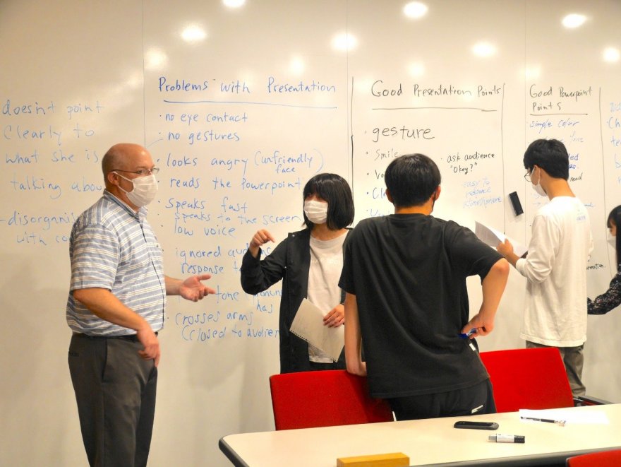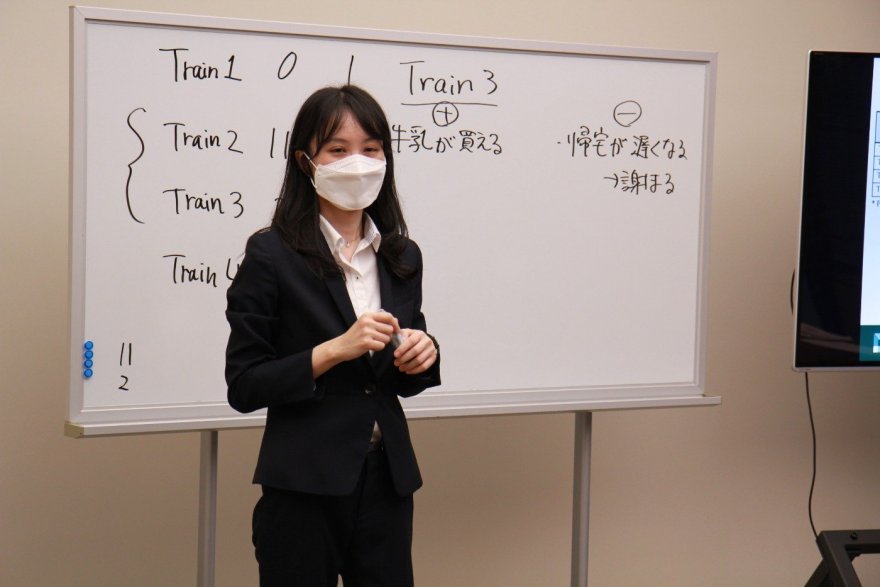 佐藤亜美先生の体験授業では、少年Harryと愛犬Mollyに関する短い物語(ケース)を使い、駅構内で見聞きする語彙表現を学びました。参加者間でスモールグループになって英会話を楽しみ、グループ討論を行うことでケースへの理解を深めました。授業開始時は、初めて聞く英単語もあり少々緊張した様子でしたが、先生のサポートのおかげで徐々に挙手発言できるようになり、和やかな雰囲気で進められました。