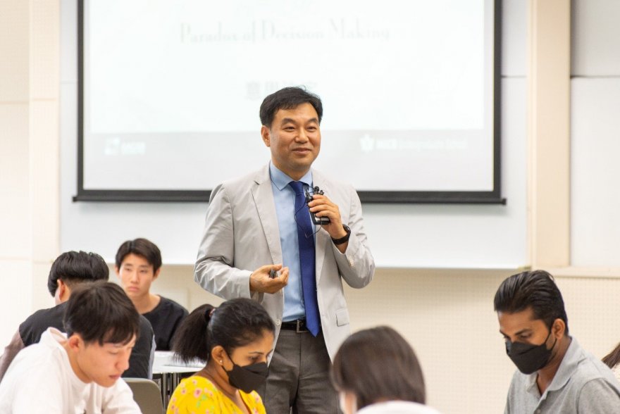 韓尚憲教授の体験授業では、「あなたが社長なら、人事採用はどのように決定するのか...」をテーマに展開。現代社会は、日々意思決定の連続です。第一に意思決定として、何を指標としてどう判断するか。続いて、チームメイトにその決定をどのように説明するのか、意見交換をしました。意思決定のワンシーンを体験してもらう授業が繰り広げられました。