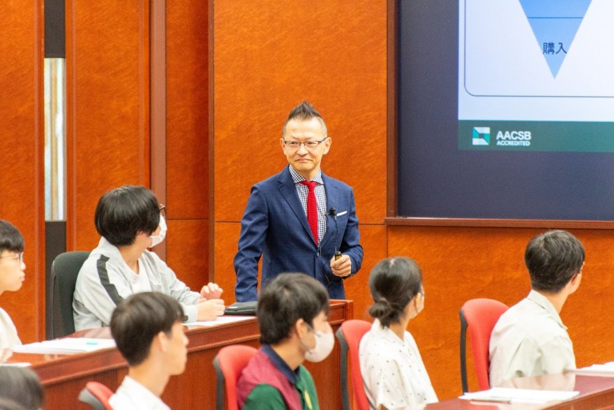 韓尚憲教授の体験授業では、「あなたが社長なら、人事採用はどのように決定するのか...」をテーマに展開。現代社会は、日々意思決定の連続です。第一に意思決定として、何を指標としてどう判断するか。続いて、チームメイトにその決定をどのように説明するのか、意見交換をしました。意思決定のワンシーンを体験してもらう授業が繰り広げられました。