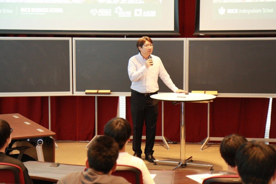 経営管理課程の学生による体験談では、自身が本学を選んだ一つの理由として、学びの特徴である「ケースメソッド」を上げ、その授業法による大学での成長について紹介。実体験を話すことで、より未来の学生生活の想像ができたのではないでしょうか。また、別の学生からは本学の充実した海外留学制度について、自身のカナダ短期留学の経験を紹介。留学前と後で語学力の向上や自分自身の成長について生き生きと紹介しました。