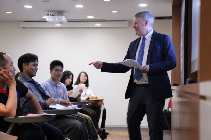 Anthony Townley教授の体験授業ではケースメソッドを用いて“sometimes”、“often”、“always”など「頻度を表す副詞」について学びました。授業ではアンケートを用いて自分の生活における忙しさを初対面の人とペアとなり、話しあうなど授業を楽しむ工夫がなされていました。英語で自分の意見を伝えるという貴重な体験ができたのではないでしょうか。