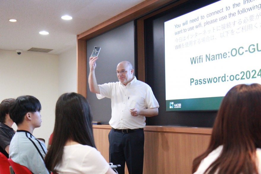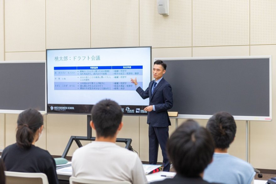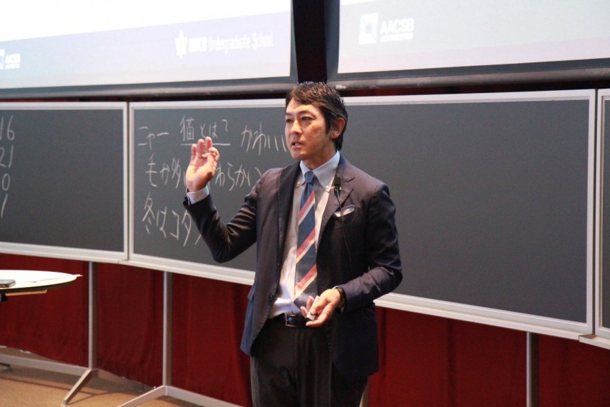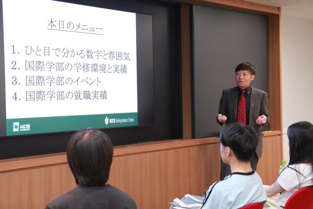 三大国際認証を取得した国内唯一の教育課程である名商大のMBA教育。横山研究科長(元APU副学長)と栗本学長より、ケースメソッドと世界標準の経営教育についてご紹介しました。