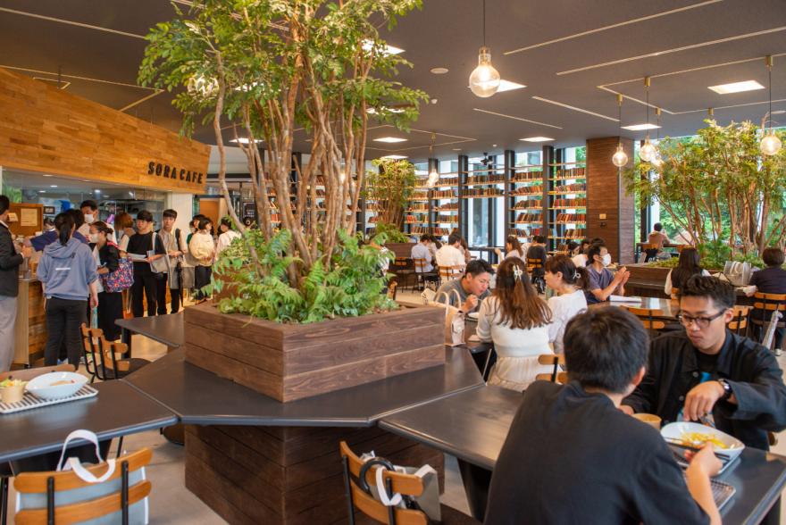 大好評のランチ体験。人気カフェ「SORA CAFE」と学生食堂「ダイニングホールハナノキ」にて、先輩学生と懇談しながらご昼食をお楽しみいただき、大学生気分を味わってもらいました。