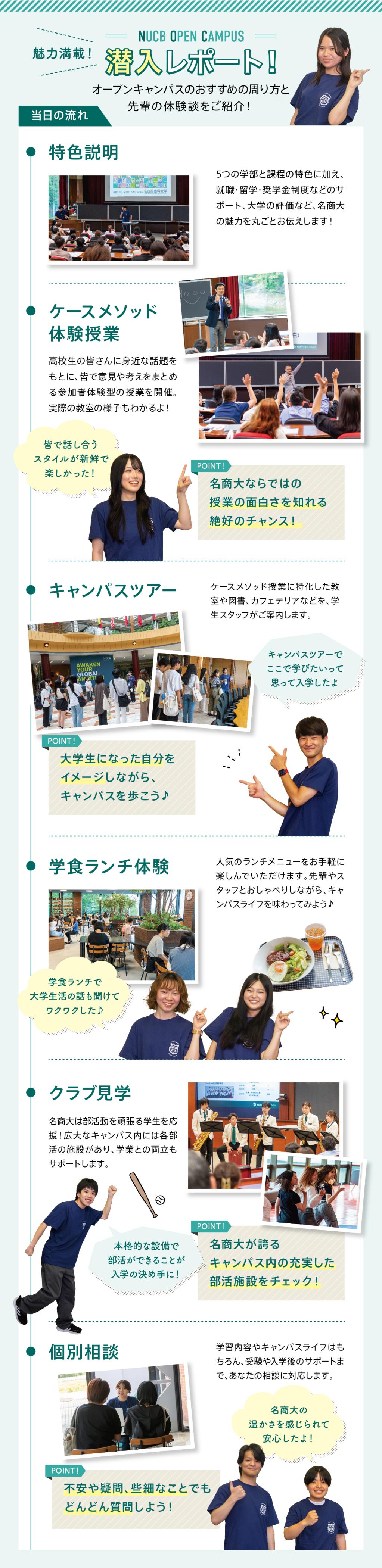 学部説明やケースメソッド体験授業、キャンパス見学、在学生体験談、個別相談など、名古屋商科大学を満喫できるプログラムがたくさん!大学生になった気分になれる1日を過ごしてみよう。皆さんの来場をお待ちしております!