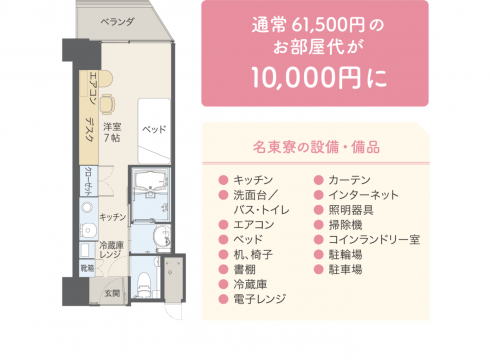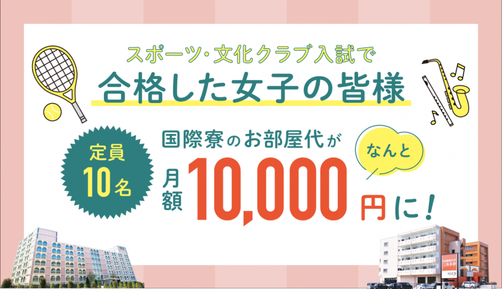 名古屋商科大学では、スポーツ・文化クラブ入試で合格した方を対象に「国際寮女子特別枠」を新設します。本学の名東寮(通常61,500円/月額)と三本木尞(通常31,000円/月額)を対象とし、定員10名に限り部屋代が10,000円/月額となります。